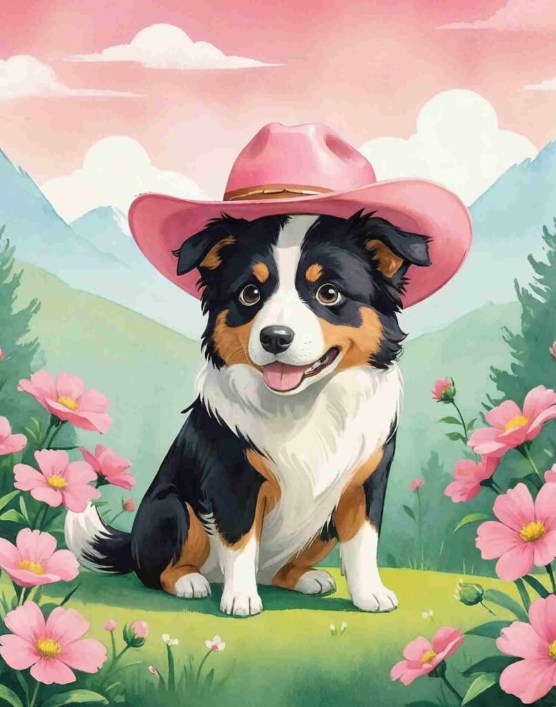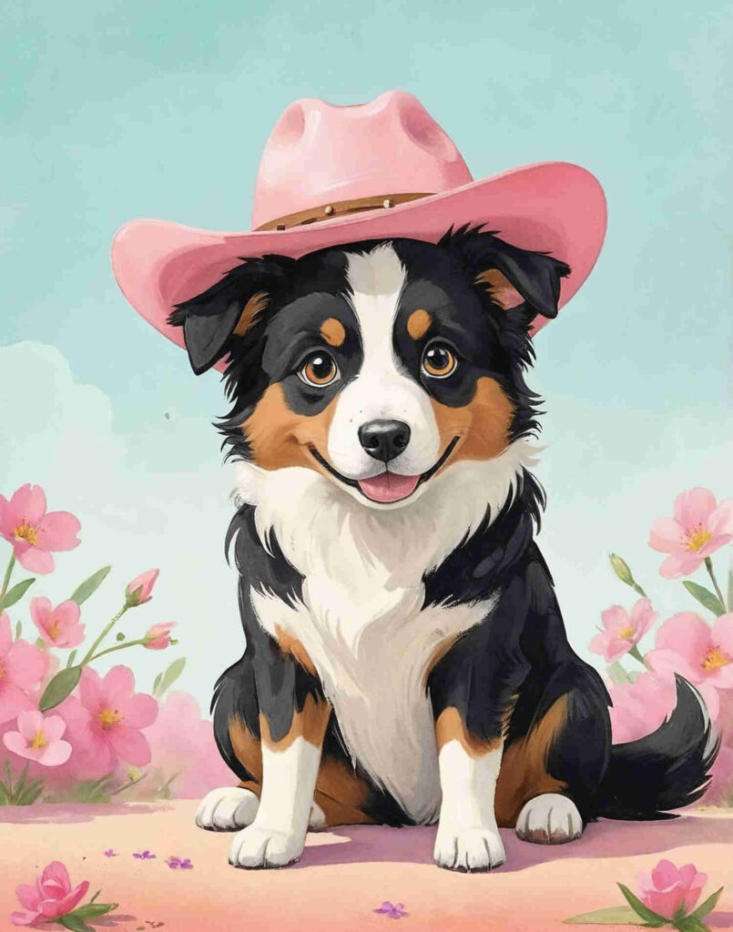 Elegant and loyal, the collie is a favorite among dog lovers. This retro-style print showcases the grace and intelligence of this beloved breed. The soft shading and gentle gaze make this piece a wonderful choice for a dog-themed room or a cozy storytelling corner.This playful yet elegant watercolor illustration features a Border Collie with a pink cowboy hat, exuding both charm and personality. Soft pink flowers frame the collie on either side, adding a delicate and cheerful touch to the composition. The hand-painted retro aesthetic makes this piece perfect for dog lovers, kids’ rooms, nurseries, or as a fun and stylish gift. Download, print, and instantly add a unique flair to your space!