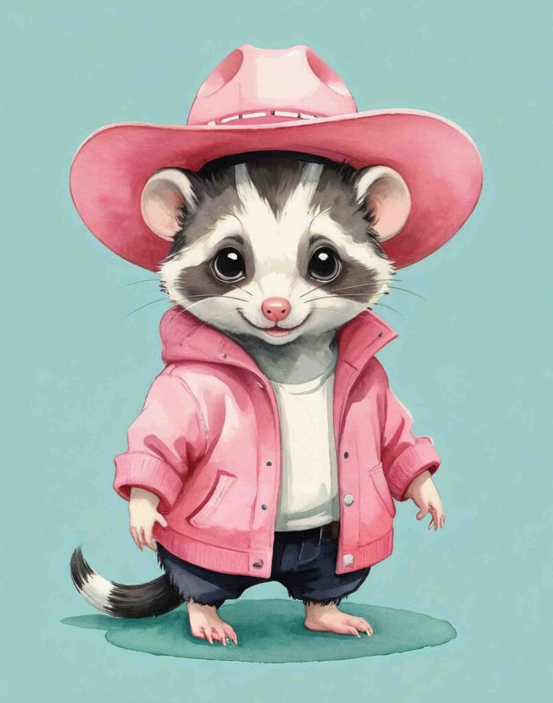 Bring a playful touch to your space with this adorable retro-style watercolor opossum illustration! This charming little opossum stands confidently, gazing directly at the viewer with a curious expression, dressed in a soft pink jacket and a matching pink cowboy hat. The teal monochrome background adds a pop of color while keeping the focus on the opossum’s quirky personality. Perfect for kids’ rooms, nurseries, or animal lovers, this printable art piece is an easy way to add a fun, whimsical vibe to your decor!